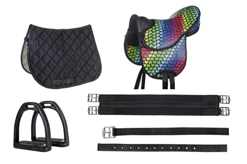HKM sadelset för shetty, minishetty eller trähäst, barnsadel färgglad med sadelrem, skrapning, stigbyglar och stigbyglar
