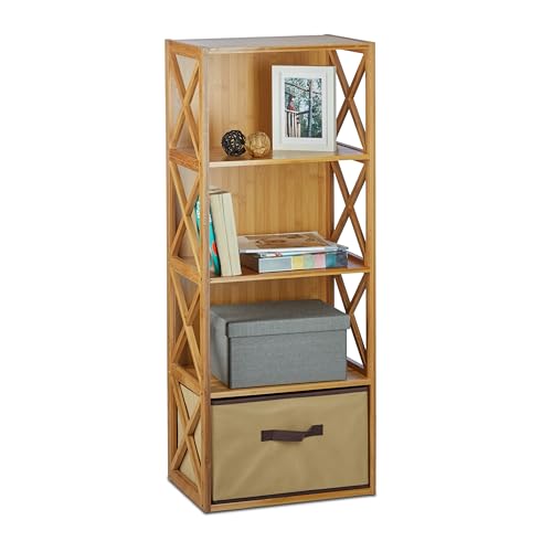 Relaxdays Bambu med korg, 4 hyllor, trähylla, badrumshylla, vikbox, H x B x D: 105 x 42 x 29 cm, naturlig brun