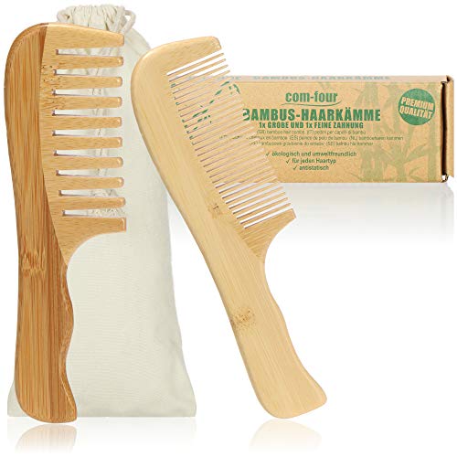 COM-FOUR® 2-delat premiumsats bambuhårkam, hårkammar av bambuträ, hållbar träkam av massivt trä, frisörkammar för alla hårtyper (2-delade kammar)
