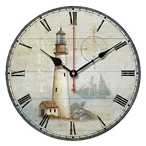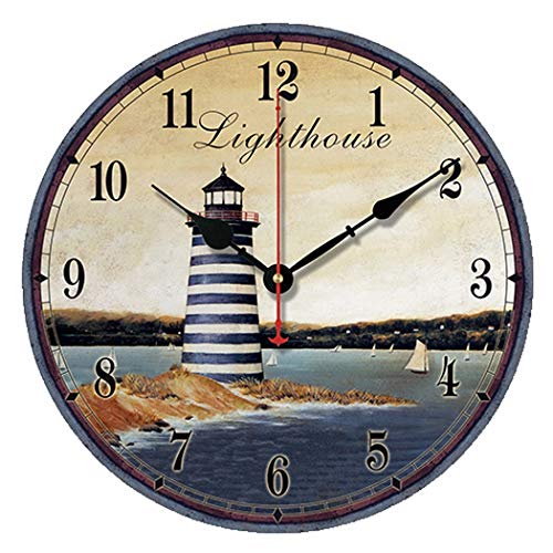 SWHONG Retro blå fyr väggklockor, kvarts icke-tickande batteridriven träklocka för vardagsrum badrum, 30 cm