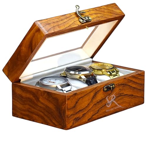 Royal Craft Expertise klockbox, klockarmband för män kvinnor med stort glaslock, träklocka display förvaringslåda med 3 – spår, indisk rosenträ herrklocka box organiserare för alla hjärtans dag