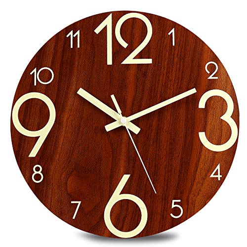 Plumeet självlysande väggklockor – 30 cm icke-tickande tyst träklocka med nattlampa – stor dekorativ väggklocka för kök kontor sovrum (platt nummer)