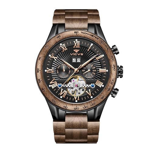 VICVS Naturlig valnöt automatisk herrklocka av trä, företag, datum, dag, multifunktionell automatisk träklocka, SVART, Armband
