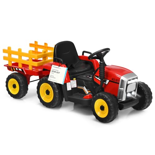 COSTWAY 12 V 3-växlad traktor med avtagbart släp och 2,4 G fjärrkontroll, barntraktor med sits, med LED-lampor, musik, signal- och USB-funktioner, lämplig för barn från 3 år (röd)