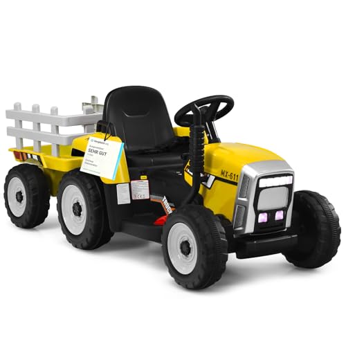 COSTWAY 12 V 3-växlad traktor med avtagbart släp och 2,4 G fjärrkontroll, barntraktor med sits, med LED-lampor, musik, signal- och USB-funktioner, lämplig för barn från 3 år (gul)