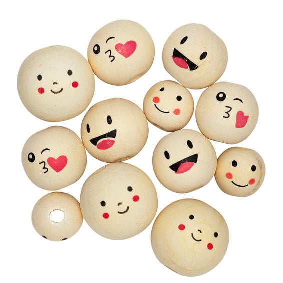 Träkulor med ansikten i form av smileys / emojis, Ø20–30 mm 12 st.