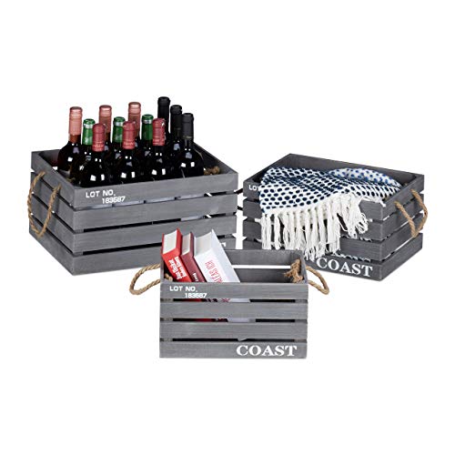 Relaxdays trälåda vintage set om 3, maritimt utseende, bokstäver, fruktlådor i 3 storlekar, förvaring och dekoration, grå