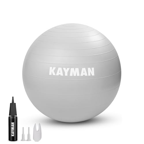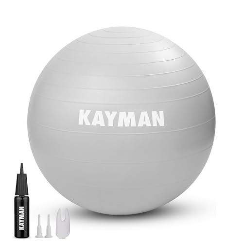 KAYMAN 65 cm träningsboll grå – anti-bristande system, halkfria ringar, hållbart material, lätt att blåsa upp, perfekt för yoga, pilates, fitness, balansträning, gym och hemträning.