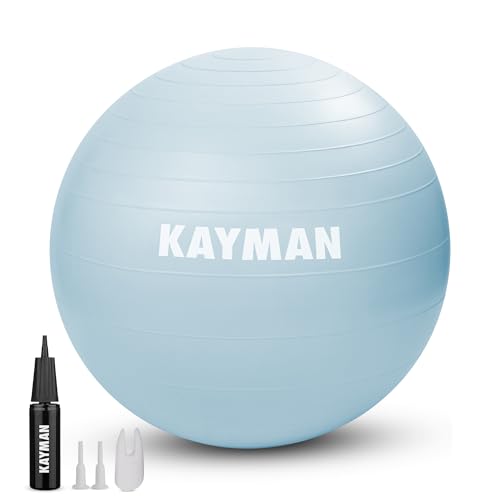 KAYMAN 65 cm träningsboll blå – anti-bristande system, halkfria ringar, hållbart material, lätt att blåsa upp, perfekt för yoga, pilates, fitness, balansträning, gym och hemträning.