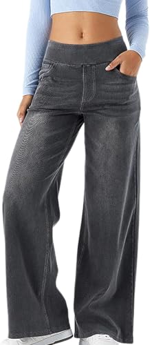 Breda ben jeans damförsäljning, stretch raka ben träningsbyxor palazzo jeans elastisk hög midja denimbyxor med fickor damer lounge träningsbyxa lös löpning vandring träningsoveraller byxor (grå, XS)