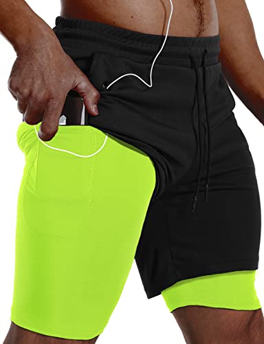 JWJ Herr 2 i 1 löparshorts snabbtorkande gym atletisk träningskläder med sidfickor, Svart grönt, M