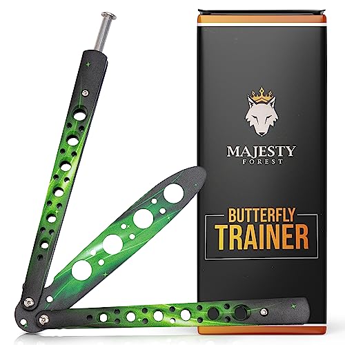 MAJESTY FOREST® Professional Butterfly Trainer - CNC-maskinbearbetad av aluminium - Juridisk balisongkniv med trubbigt blad som träningskniv - Inklusive tillbehör. (Green)