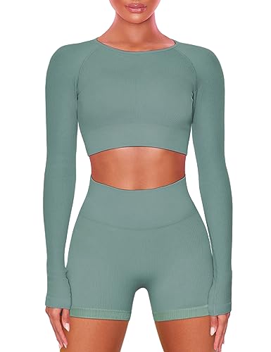 Buttergene träningsset för kvinnor, 2 delar, långärmade yogakläder, gymkläder, sömlös, ribbad magtröja, hög midja leggings, 1top+shorts-salvia grön, S