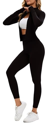 Belriviere tvådelat träningsoverall för kvinnor långärmad dragkedja jacka med atletisk hög midja leggings träningsset, Svart, S