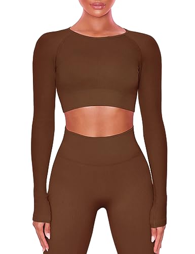 Buttergene träningsset för kvinnor, 2 delar, långärmade yogakläder, gymkläder, sömlös, ribbad magtröja, hög midja leggings, Topp + leggings-brun, S