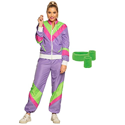Boland - Träningsset för kvinnor, lila-grön, 80-talet träningsoverall och 3-delat svettbandsset, badknapp, kostym, karneval, temafest