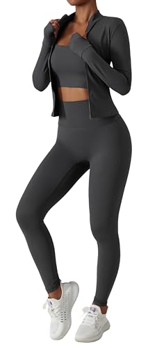 Belriviere tvådelat träningsoverall för kvinnor långärmad dragkedja jacka med atletisk hög midja leggings träningsset, Djupgrå, XL