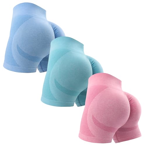 OVESPORT Träningsshorts dam, 3-pack, sömlös scrunch butt, rumplyft, hög midja, yoga, gym, löpning, kortbyxor, S