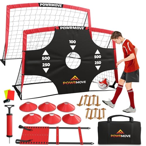 POWRMOVE Fotbollsmål för bakgården – bärbara fotbollsmål set med 2 med pump, koner, träningsstege, boll och bärväska – 6 fot x 4 fot fotbollsnät, hållbar fotbollsträningsutrustning för barn och vuxna