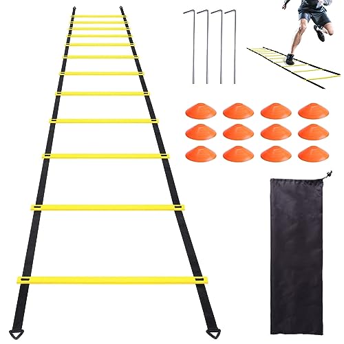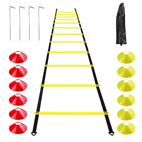 LWuuywa Fotboll träningstillbehör barn och vuxna, träningsstege koordinationsstege 6 m, 12 ribbor, träningsstege med 12 hattar, 4 stolpar, bärväska, träningsset, gåvor, pojkar