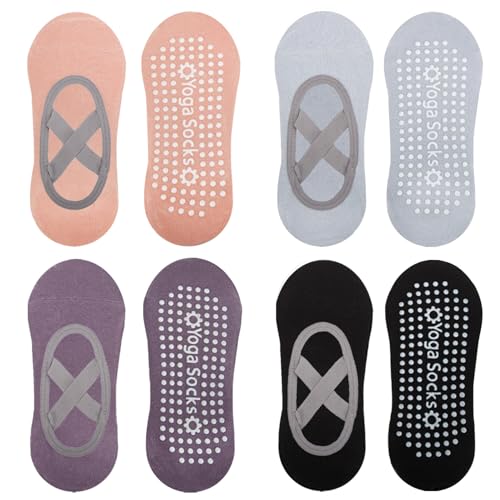 Ewwtrey 4 par yogabyxor, pilatesstrumpor halkfria kvinnor, halkfria yoga pilates greppstrumpor med remmar för kvinnor män, yoga pilates balettbarre dans sjukhus barfota träningsstrumpor, flerfärgad,