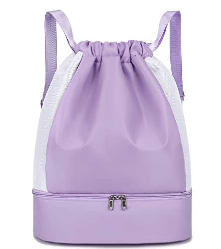 Keyck Gym Bag Drawstring Daypack, Vattentät Ryggsäck Med Skofack och Våtutrymme, Stor Sportväska för Kvinnor Män Tonåringar, Gympapåse Träningsväska för Sportresor Simning Fotboll, Lila