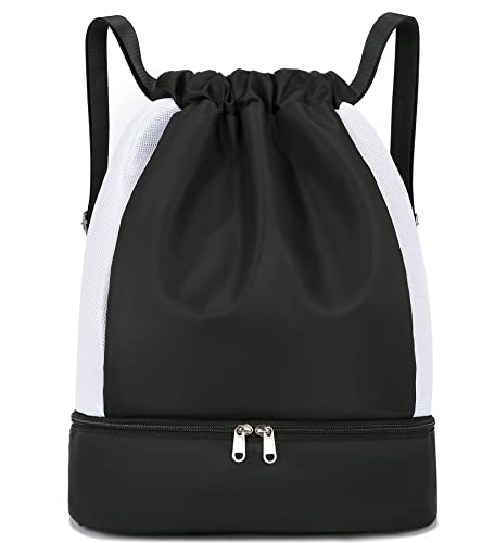 Keyck Gym Bag Drawstring Daypack, Vattentät Ryggsäck Med Skofack och Våtutrymme, Stor Sportväska för Kvinnor Män Tonåringar, Gympapåse Träningsväska för Sportresor Simning Fotboll, Svart