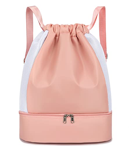 Keyck Gym Bag Drawstring Daypack, Vattentät Ryggsäck Med Skofack och Våtutrymme, Stor Sportväska för Kvinnor Män Tonåringar, Gymväska Träningsväska för Sportresor Simning Fotboll, Rosa