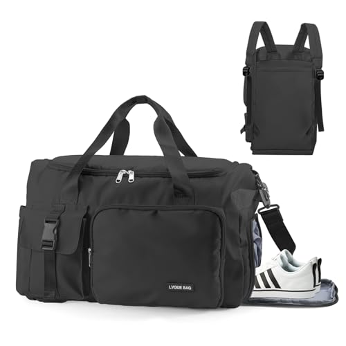Feelhap sportväska kvinnor män 42 l resväska stor sportväska ryggsäck med skofack våtfack sportryggsäck vattentät träningsväska weekender Travel Duffle Bag med ryggsäck för män kvinnor, 42 l – svart,
