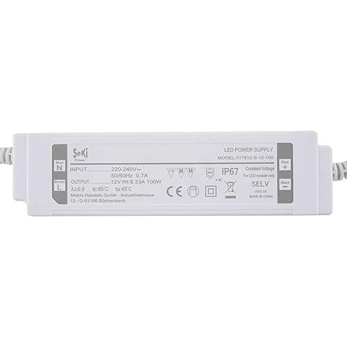 SeKi 12 V DC 100 W 8,33 A konstant spänning LED-drivrutin; IP67 vattenskyddad transformator, växelströmförsörjning; ingen minsta last, inget buller/LED-flimmer, MM godkänd