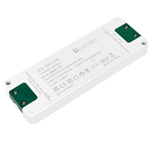 Lacasa LED Transformator 12V 5A, 60W Strömförsörjning AC200-240V till DC12V LED Drivrutinskonverterare Adapter, Ultra Slimmad Konstant Spänning LED Driver för LED-remsor, G4 MR11 MR16 LED Glödlampor