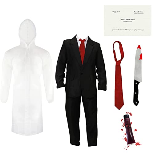 Patrick Bateman vuxen kostym – stor – svart kostym, transparent regnrock, röd slips, falsk kniv, visitkort och falskt blod – herr psycho amerikansk TV-filmkaraktär halloween karneval kostym