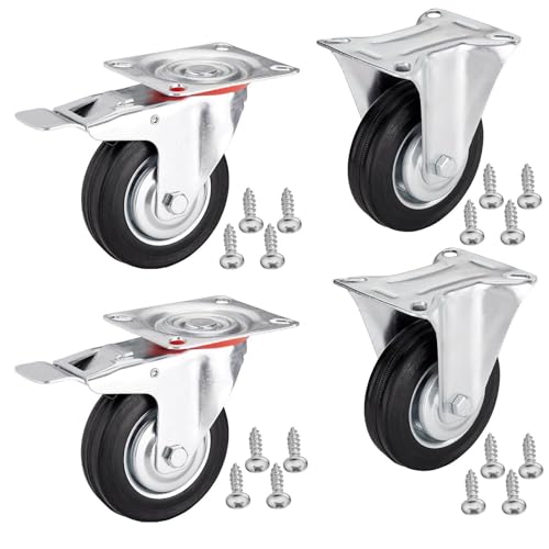 DBREAKS Möbelhjul 50 mm, 4 st svängbara hjul med broms, gummihjul med 20 skruvar, typ L monteringsplatta, transporthjul för spjälsängar och vagnar