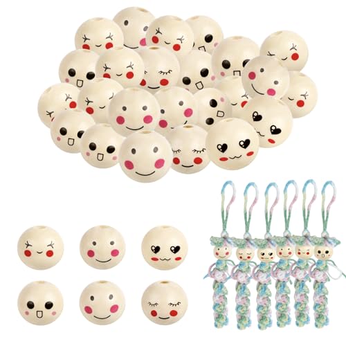 AiQInu 60 st naturliga träpärlor, 20 mm runda träpärlor med hål, leende ansikte för gör-det-själv smyckestillverkning, till jul hantverk, halsband, armband