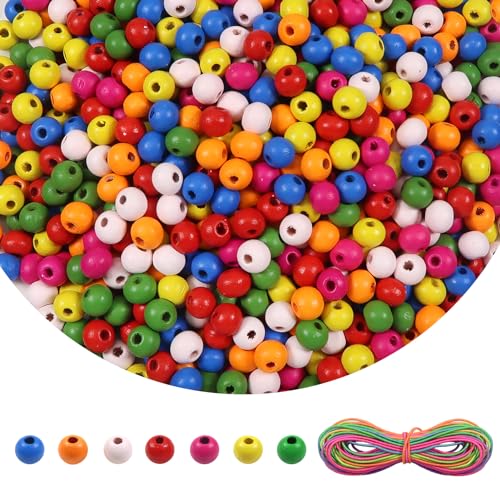 TOAOB 1 000 st naturliga färgade träpärlor 6 mm med hål träbollar och 5 meter blandad färg elastisk linje för armband, halsband, hantverk, gör-det-själv-dekorationer