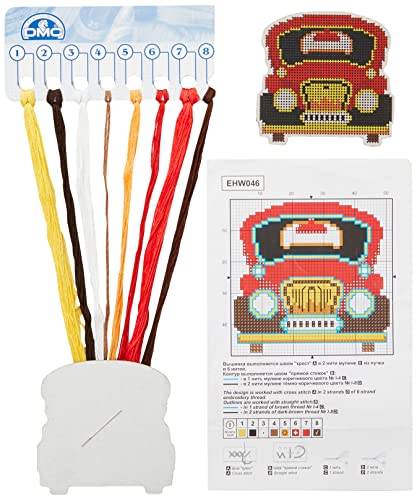 RTO EHW046 bil röd korsstygsset på träplatta, bomull, flerfärgad, 8,8 x 8,5 cm
