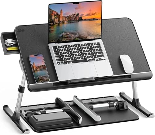 SAIJI Laptbord sängbord, 100 % E0 Eco träplatta, justerbart sängbord, med låda, vikbara ben, 40 kg belastning, bordsskiva av PVC-läder, läsning, mat för säng och soffa