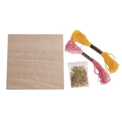Rayher 70024000 pysselset nagelbild motiv blomma träplatta, naturlig, 14 x 14 x 0,9 cm, 3 strängar garn i färgerna gul och rosa, 166 dragsnöre, fiberspänning