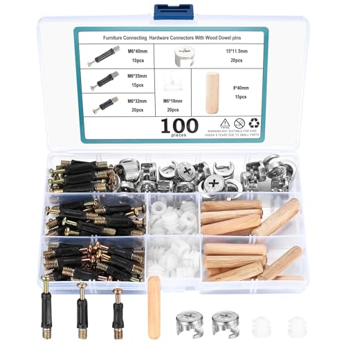 100 st excentriska möbelkontakter, inkluderar inläggsskruvar, plastmuttrar, kamfäste, träpluggar, fästskruvsats för möbler, skåp