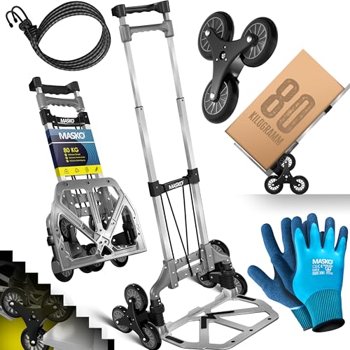 MASKO® Steg- säckkärra trappkärra vikbar 80 kg lastkapacitet 3 x 3 trappklättrare inklusive hjul 2 expanderlinor handskar – höjdjusterbart handtag – aluminium handkärra för transportkärra grå