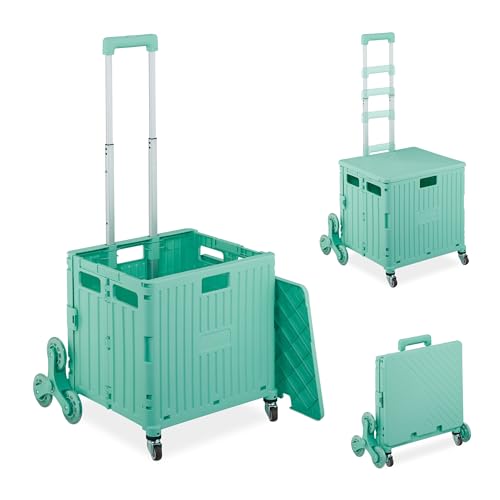 Relaxdays Shoppingvagn trappklättrare, vikbar, shoppingkorg med hjul, lock, teleskophandtag, upp till 35 kg, turkos