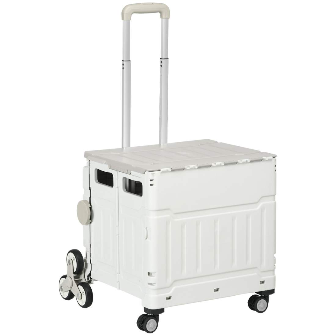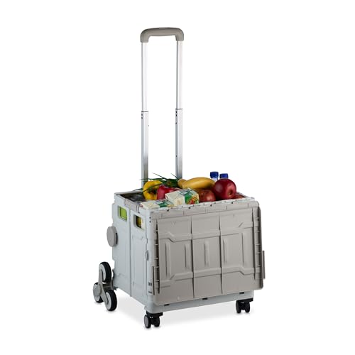 Relaxdays Shoppingvagn trappklättrare, vikbar, shoppingkorg med hjul, lock, teleskophandtag, upp till 50 kg, vit/grå