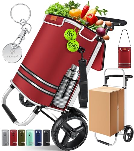 KESSER® Hopfällbar shoppingvagn med 56 liter kapacitet och kan belastas med upp till 50 kg, 3-i-1-vagn, säckkärra och axelväska, inkl. kylfack och kundvagnsmynt, trappklättrare, vinröd