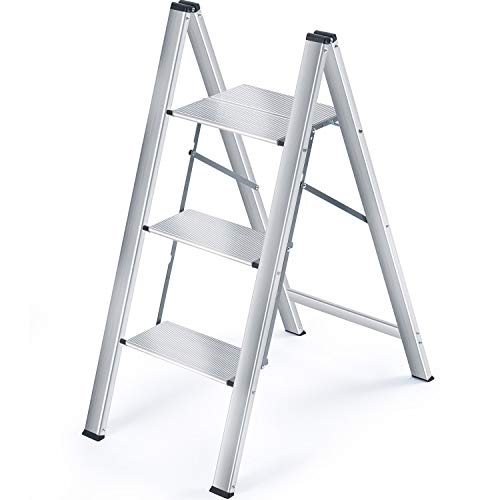 KINGRACK Trappstege med 3 steg, vikbar stege i aluminium, bärbar smal köksstege, säker hushållsstege, trappstege med multifunktion, silver