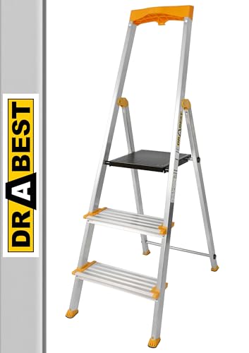 DRABEST Trappstege 3 steg hopfällbar - Aluminiumstege - Stabil hopfällbar stege med hylla och breda steg - 120 mm, Halkfri - Stege för hushållsbruk och arbete - upp till 150 kg