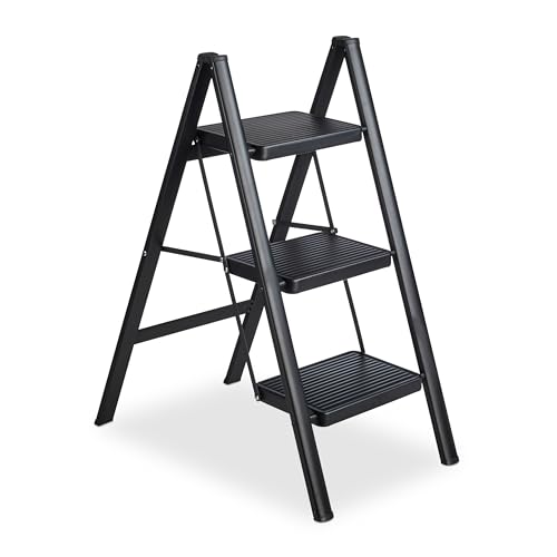 Relaxdays Vikbar stegstege, 3 steg, lätt trappstege, stål, stege upp till 120 kg, HxBxD 85 x 42 x 66 cm, svart