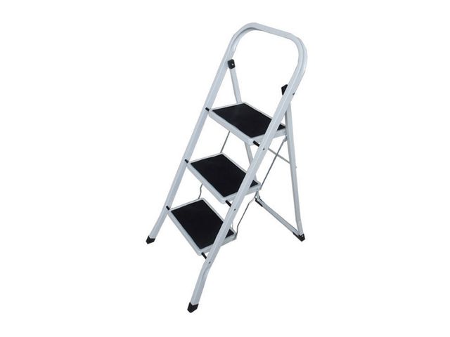 hjh OFFICE Hopfällbar stegee 3 steg SOLID W2 Stål Stegstege hushållsstege lätt halkfri trappstege bärbar, kapacitet upp till 150 kg, halkfri gummiplatta, Vit