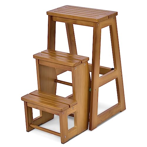 GIANTEX Köksstege/pall, av trä, 3 steg, trappstege, hopfällbar, i furu (kaffefärg)
