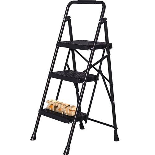 BONTEC trappstege 3 steg hopfällbar stegpall med kapacitet 272 kg, halkfria breda pedaler, robust stege i stål med svampstyre för hem, kök, skafferi, inomhus och utomhus