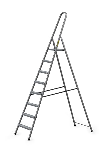 DRABEST - trappstege - med 8 steg - kan belastas med upp till 125 kg - 2,43 m lång - arbetshöjd 3,68 m - trappstege, arbetsstege av stål pulverlackerad - för hushåll, målningsarbete - grå